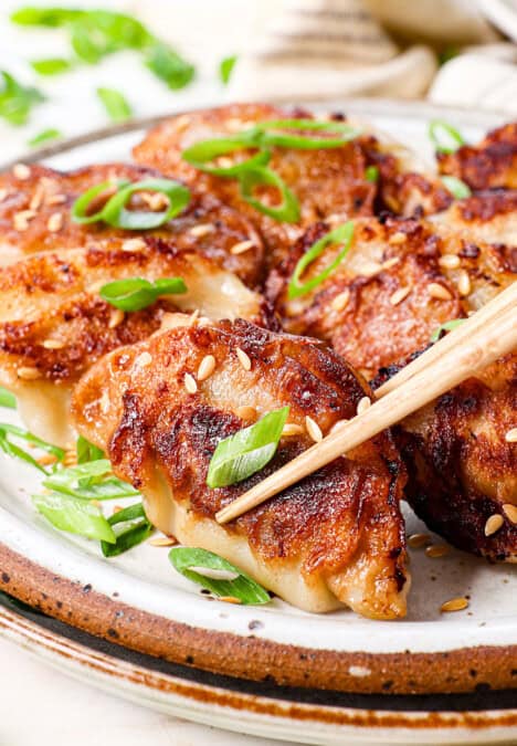 up close of baked potatoes in air fryer being served on a plate garnished with green onions
