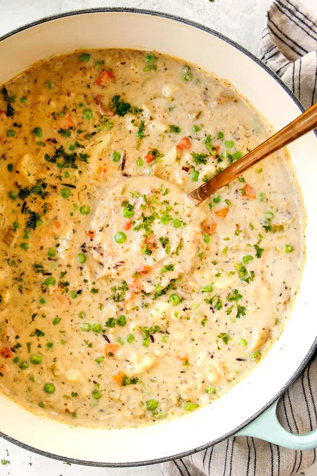 This creamy Chicken and Wild Rice Soup is a creamy, hearty, satisfying meal all made in one pot loaded with juicy chicken, hearty wild rice, carrots, celery, cauliflower and peas for a symphony of texture in every bite -without any โcream ofโ soups.ย