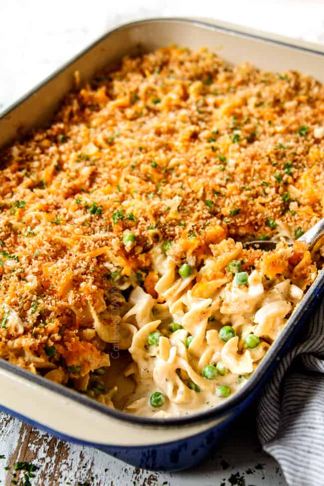 This Tuna Casserole Recipe is made from scratch without any canned soups or mayo!ย Just tuna and bright peas enveloped in the most flavorful rich, creamy cheese sauce all topped with golden crispy panko.ย