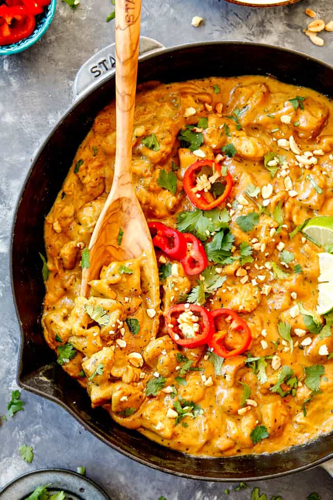 Peanut Butter Chicken is one of the easiest dinners ever bursting with intoxicating Thai flavors made with pantry friendly ingredients on your table in 20 minutes (AKA chicken satay skillet)! Itโs loaded with tender, juicy chicken swimming in the most intoxicating, lusciously creamy, wonderfully fragrant, comforting peanut sauce infused with garlic, ginger, basil, lime juice and coconut milk. ย
