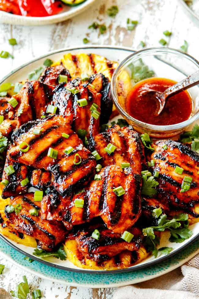 Sweet and tangy Hawaiian Chicken with only 10 minutes of prep! ย To make, simply whisk together pineapple juice, soy sauce, brown sugar,ย Asian sweet chili sauce, ginger and garlic, marinate then grill โ thatโs it!ย