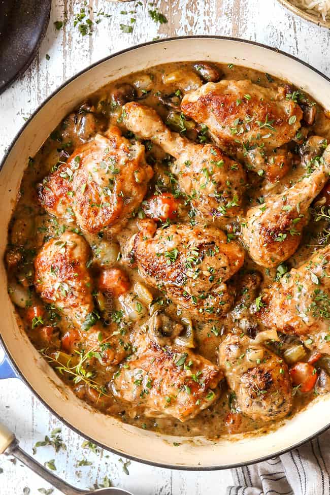 Chicken Fricassee all made in one pot, loaded with succulent golden chicken and tender veggies swimming in a rich, creamy, herb laced sauce.