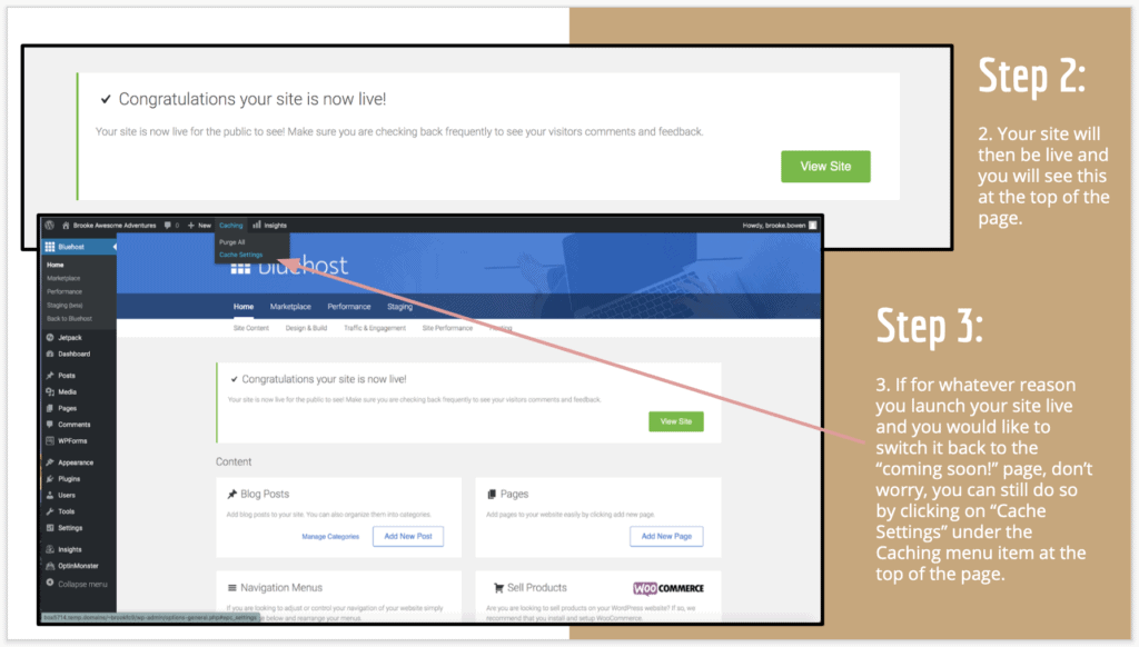 If for whatever reason you launch your site live and you would like to switch it back to the “coming soon!” page, don’t worry, you can still do so by clicking on “Cache Settings” under the Caching menu item at the top of the page.