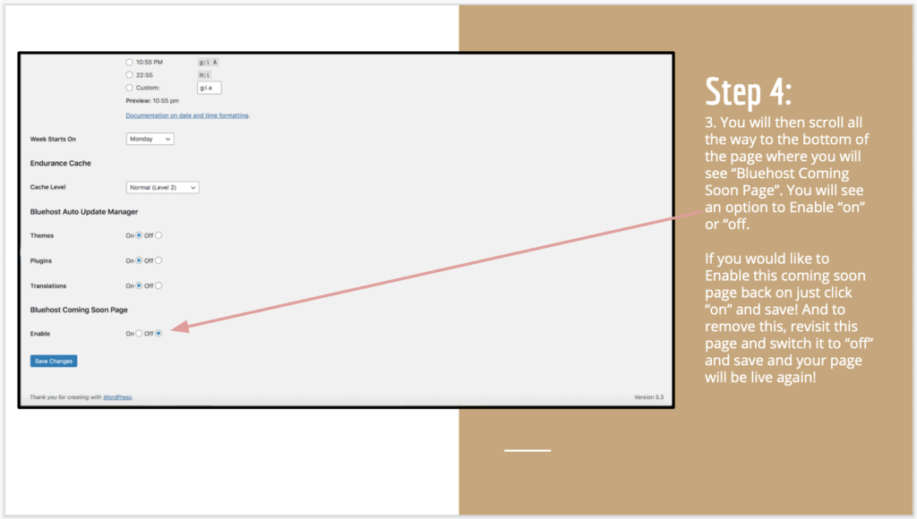 You will then scroll all the way to the bottom of the page where you will see “Bluehost Coming Soon Page”. You will see an option to Enable “on” or “off.