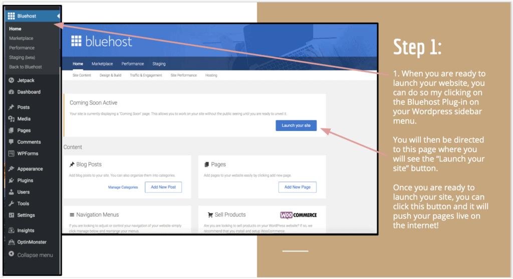 When you are ready to launch your website, you can do so my clicking on the Bluehost Plug-in on your Wordpress sidebar menu.