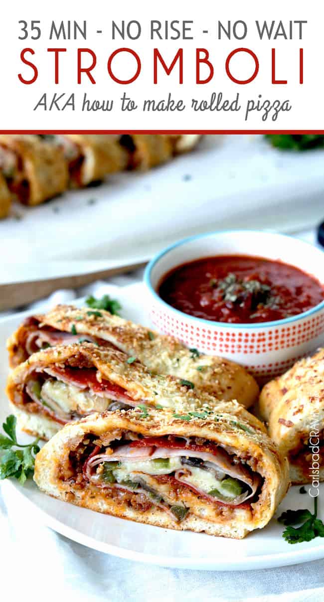 This Easy Stromboli Recipe (AKA rolled up pizza) is made with NO WAIT, NOT RISE Stromboli dough so now you canย satisfy your pizza cravings in 35 minutes!ย ย Readers call it, โAmazingly delicious and simple,โ โsooo good,โ โfamilyโs favorite,โ and โalways a hit!โย This recipe includes a simple yet spectacularly flavorful pizza sauce, how to customize your toppings, and how to freeze for make-ahead instant Stromboli.