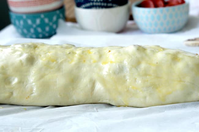 - Roll tightly:ย Starting from the long side closest towards you, tightly roll up the dough, pinching in any toppings that try to escape.ย It takes a little patience to go from left to right rolling up the dough, but I promise, it is easy and it doesnโt have to be pretty!