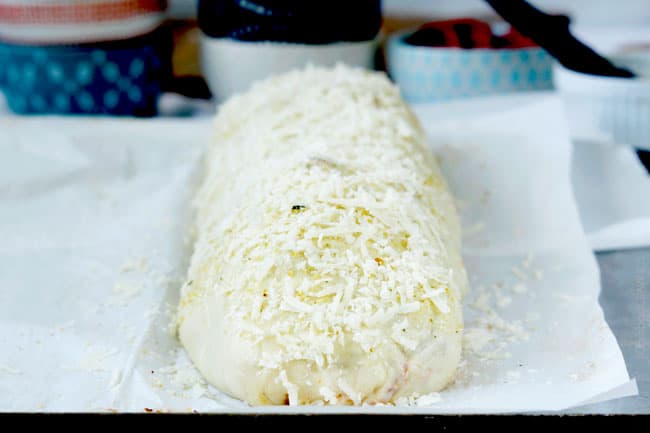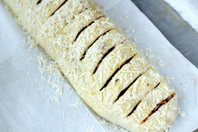 - Sprinkle Stromboli with freshly grated Parmesan cheese and garlic salt, cut some slats to let steam escape. Donโt worry at this point that your dough seems super thin, it will rise and beautify into soft pizza crust in the oven.