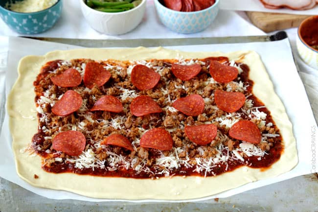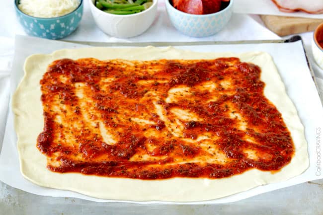 - Leave a clean border around the dough:ย When we spread the Pizza Sauce,ย ย we want to take care to leave a 2โณ border all around the dough so there is enough dough to seal once rolled up.ย The toppings will naturally push forward as you roll the dough up, so this also helps you fit all your toppings in with a little extra leeway.