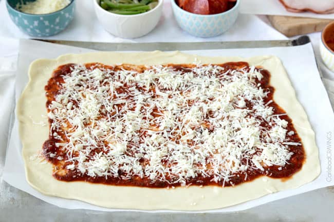 - Add toppings: Lightly spread sauce over the dough, leaving a 2 inch plain dough border along the edges. Top sauce with half the grated cheeses, followed by meats, then vegetables followed by remaining cheese.