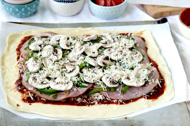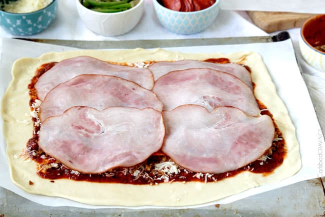 - And then honey ham. ย Because I can.ย ย I went a little crazy on my toppings so I could show you how to incorporate them all โ or because I wanted to eat them all โ but you can customize your Stromboli recipe with as many or as little toppings as you like.