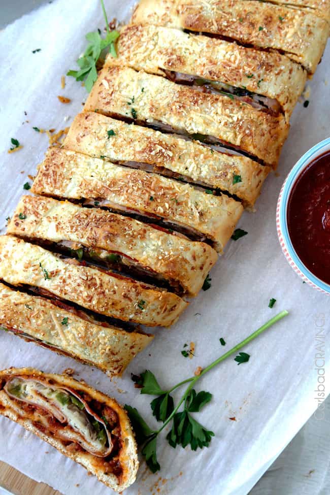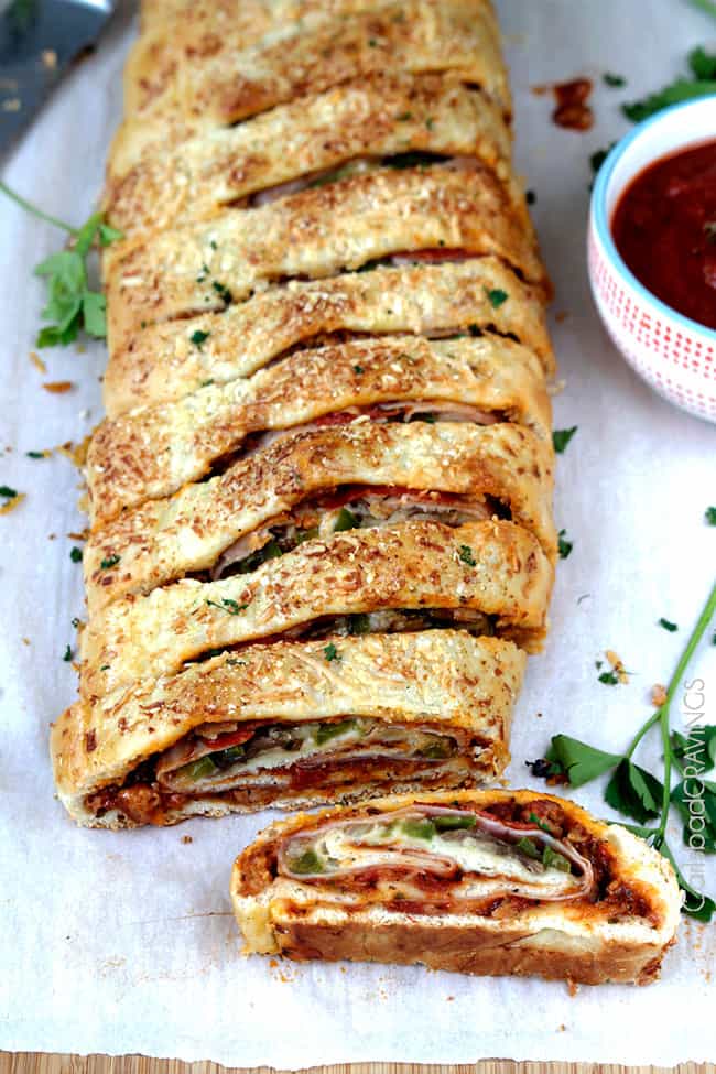 - When your beautifully golden Stromboli pizza emergesย from the oven, let it cool for 5 minutes or so, then cut down the slats to create slices of rolled pizza perfection.ย ย Thenย melty, meaty, cheesy homemade Stromboli is served!
