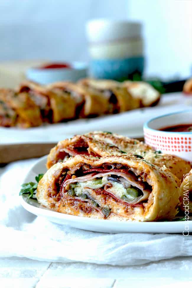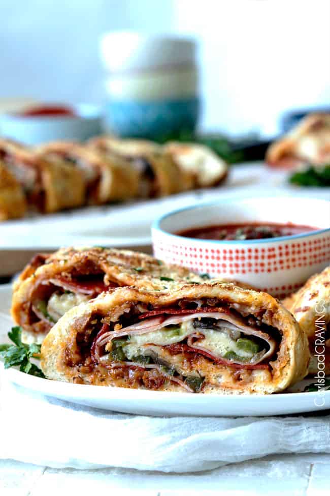 Do you LOVE Stromboli?!ย Is it too scandalous to admit I like Stromboli even better than pizza?ย After all, itโs basically a rolled up pizza so you haveย LAYERSย of pizza in each cheesy, meaty, saucy, garlic, Parmesan crust mouthful.ย ย They long cylinder is baked to golden perfection then sliced into individual rolls.