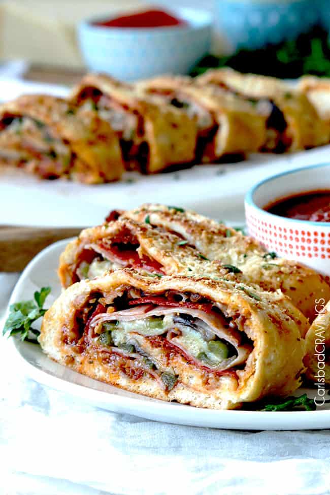 If you are serving Stromboli for Game Day, then its fabulous with Bacon Ranch Cheese Ball,ย Buffalo Chicken Wings,ย Queso Fundido, Jalapeno Popper Dip,ย Chipotle Chicken Empanadas and Spinach Artichoke Dip.