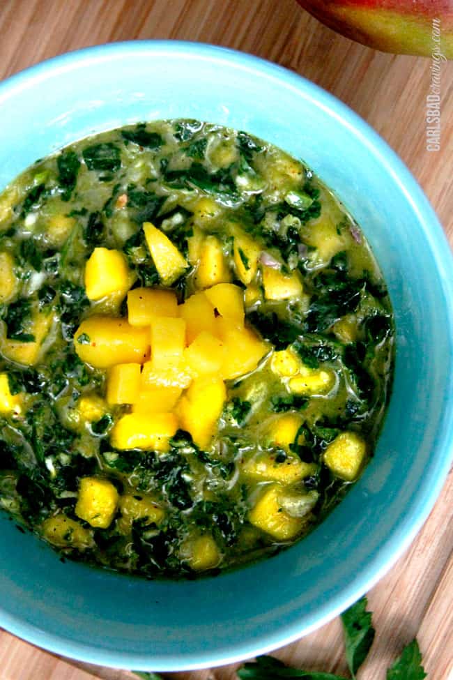 To make this chimichurri recipe with mangos, I added cilantro, jalapeno, honey, mango and a dash of chili powder. ย Its sweet, tangy, spicy and simply packed with flavor all brightened by the sweet, fresh mangoes throughout. ย It makes a delectableย marinadeย and as a sauce, instantly dresses upย everything.
