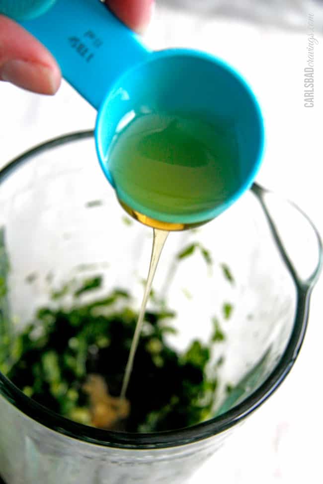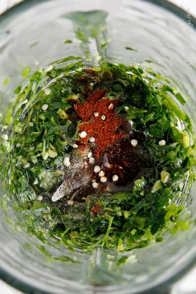 - Add honey, oil, vinegar, chili powder, salt and pepper. Continue to pulse to make a soupy vinaigrette, adding additional oil if you prefer a thinner chimichurri.
