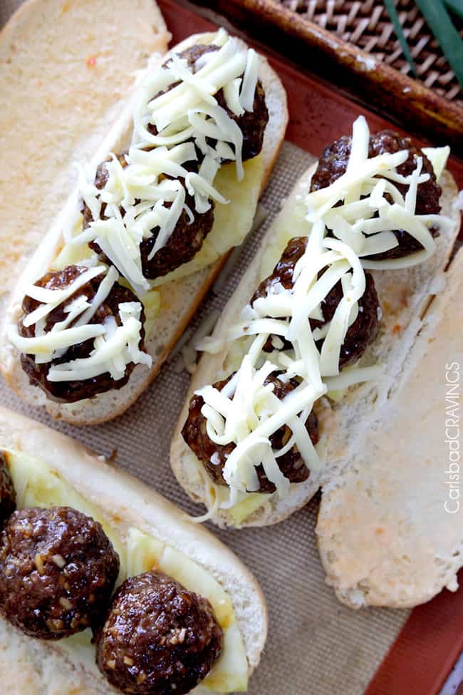 - Assemble: Top the pineapple-lined rolls with 3-4 meatballs (or whatever fits your roll). Sprinkle evenly with cheese and broil until the buns are golden and the cheese is melted. Top with the Snow Pea Slaw and devour!