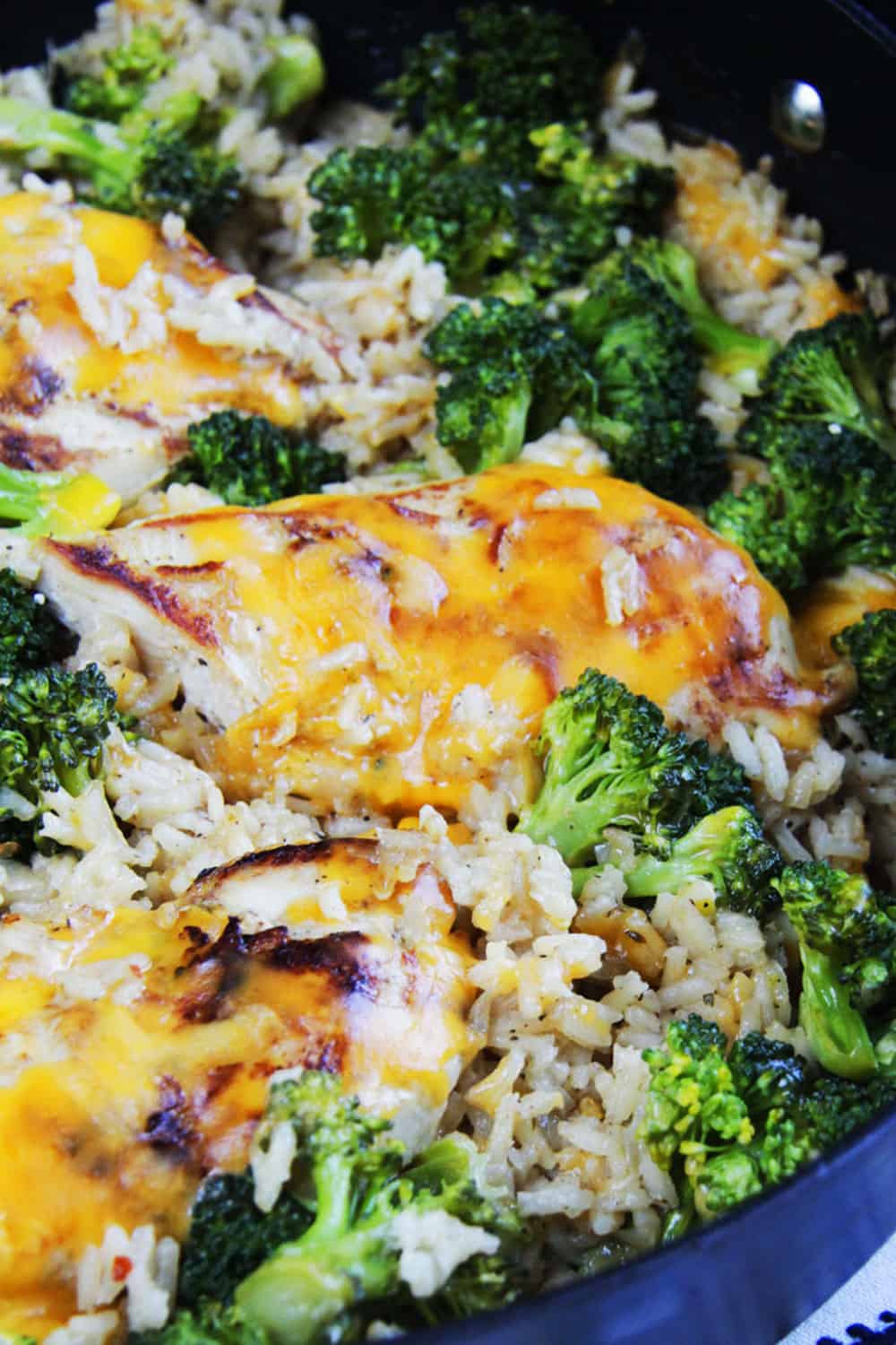 - After 12 minutes, stir the rice then add the chicken, nestling it into the rice. Add the broccoli on top. Recover the pot and cook on low for 10-15 minutes longer, or until rice and chicken are done and broccoli is crisp-tender, taking care skillet isn’t cooking too hot or else it will burn on the bottom. Once rice and chicken are done, sprinkle with cheese. Recover until cheese melts. Serve!