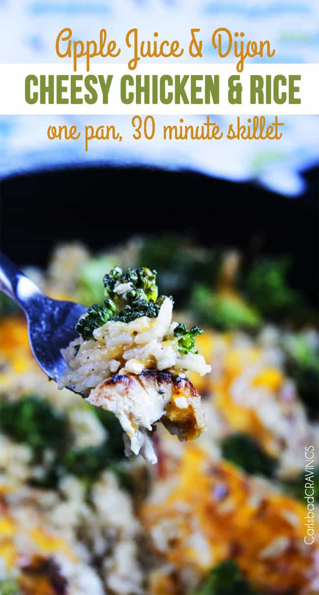 This is Apple Juice & Dijon Cheesy Chicken, Broccoli, Rice Skillet is crazy craving good!