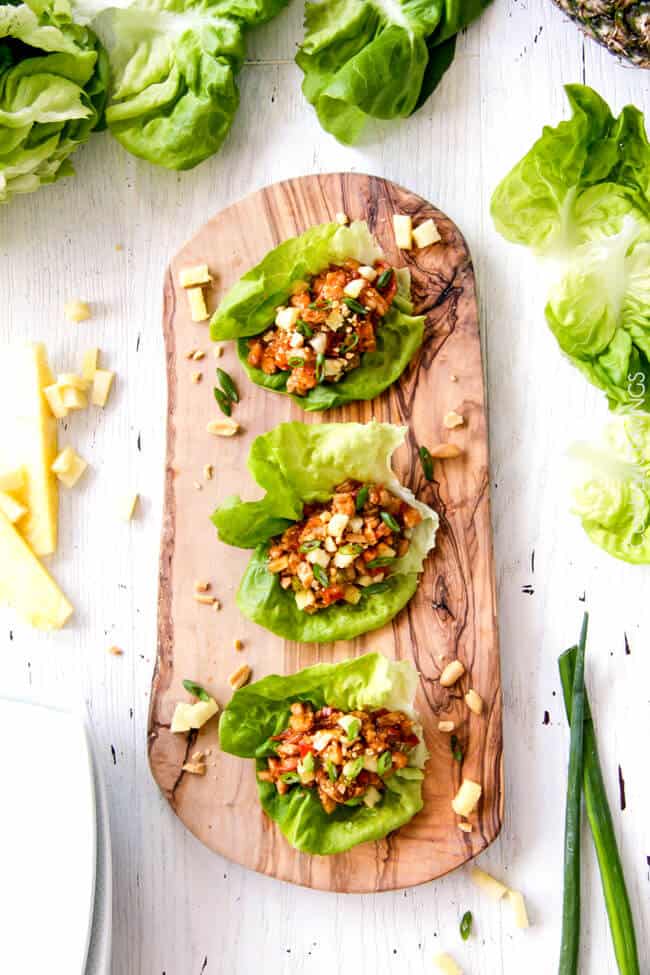 These Thai Chicken Lettuce Wraps are quick and easy, bursting with fresh ingredients, smothered in an unbelievable Pineapple Hoisin Peanut Sauce that is sweet, spicy, savory andย 1000X better than takeout! They are healthy, customizable, make ahead friendly and can be served as an appetizer or main course!