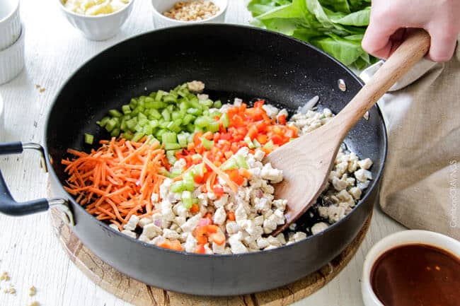 You can customize the veggies with what you have on hand, omit what you donโt like, add more of what you do.ย You can use diced mushrooms, water chestnuts, zucchini, bok choy, bean sprouts, etc, just make sure you have CRUNCH!ย