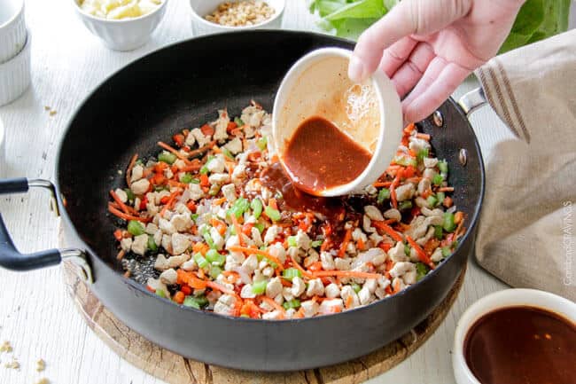 - Taste the filling before assembling the lettuce wraps:ย Add rice vinegar for tangier, brown sugar for spicier, sriracha for spicier or additional seasonings.