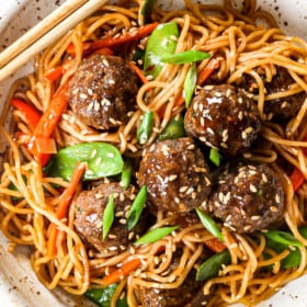 This Asian Meatball recipe with yakisoba is an easy, flexible meal solution for busy weeknights but also 5-star spectacular for company! The Asian Meatballs are juicy, tender, flavor bombs, tossed with my favorite, easy-to use, Fortune Yakisoba Noodles and crisp-tender stir-fried veggies, all enveloped in a dynamic sticky, sweet, tangy, honey sesame sauce punctuated by zesty ginger, punchy garlic and chili sauce. This recipe is a symphony of tantalizingย flavors and textures thatโs easy to customize with whatever veggies you have on hand. Best of all, the Asian Meatballs get baked while you prep the rest of the ingredients, then itโs just a 10-minute stir fry to dinner!ย Serve it up with some potstickers,ย crispy crab rangoonsย orย egg rollsย for pure taste bud magic.