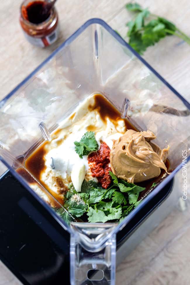 This Thai Peanut Dressing is super easy, lusciously creamy with layers of fabulous flavor.ย This velvety dressing is created in blending peanut butter, coconut yogurt, red curry paste,ย Asian sweet chili sauce, cilantro and splashes of lime and soy sauce โ can you taste it now?!ย This spicy Thai Dressing recipeย can be be used as a dressing, sauce, marinade or dip for salads, wraps, chicken, etc. because with one taste, you are going to want to douse this Thai Peanut Dressing on EVERYTHING!ย ย