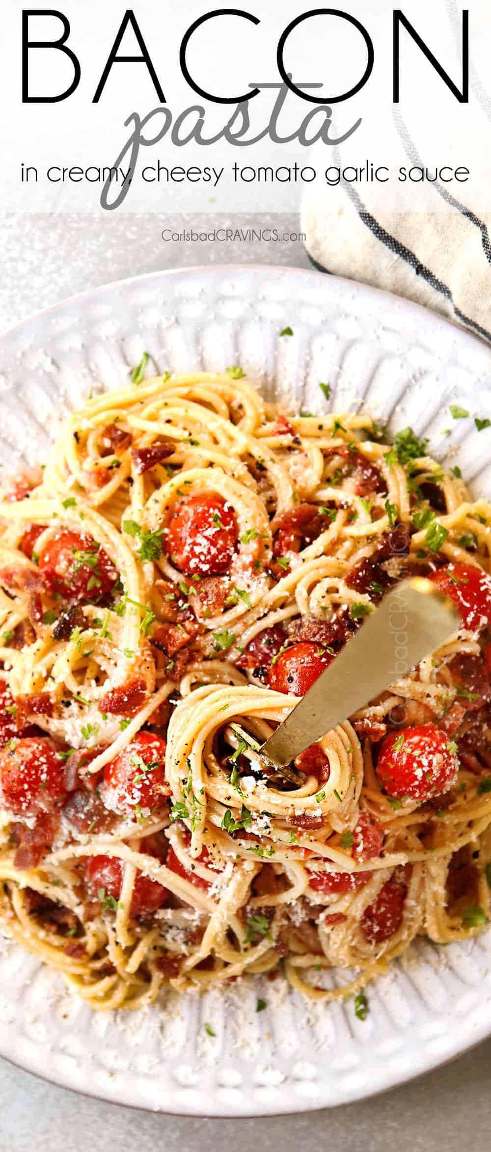This Bacon Pasta is guaranteed to become a family favorite with its intoxicating aroma, smoky, salty, porky-sweet flavored, shatteringly crispy bacon and cozy, comforting, luxurious sauce.ย Itโs made with loads of fresh garlic and crispy bacon enveloped in a creamy, cheesy sauce spiked with blistered cherry tomatoes, Italian seasonings, salty Parmesan and sweet, buttery Gouda (may sub cheddar). ย You can keep the Bacon Pasta recipe simple or pump it up with shrimp, chicken or any veggies of choice such as broccoli, bell peppers, or asparagus.ย Your family will love this easy indulgent pasta dinner with a side of Garlic Bread or Buttery Breadsticks and fresh Green Bean Salad.