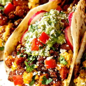 This Breakfast Tacos recipe is โoff the chain!โ according to readers, and โSo good and so easy to make.โ They are elevated by the BEST fluffy, cheesy fiesta eggs worthy of their own post and turkey chorizo hash packed with all the flavor without all the grease. With tips, tricks (like how to prep ahead), and endless customization optionsโthese tacos will become a favorite satisfying breakfast, lunch, or dinner!