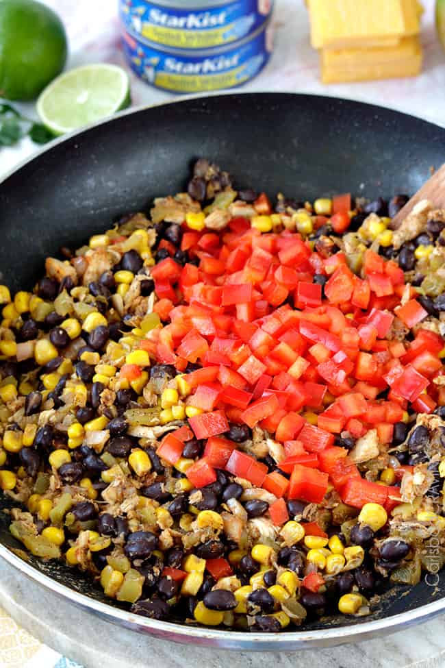 But it can. StarKistยฎAlbacore White Tuna is so much more than sandwiches and casseroles. ย Its hearty, flavorful, and heart healthy, making it an ideal low-fat protein in any meal or appetizer, like these close your eyes so you canย savor its deliciousness Baja Tuna Melt Cups with Mango Broccoli Slaw. These little cups pack a punchย of texture, flavor and spice that beginsย with a quick 5 minute sautรฉย of tuna, black beans, sweet, crunchy corn, fresh red bell peppers, onion, garlic, green chilies and plenty of cumin, chili powder, smoked paprika and cayenne.