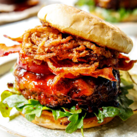 These BBQ Burgers are an amazingly juicy explosion of sweet, tangy, spicy, smokey, crispy deliciousness all at the same time. Theyโre smothered in homemade BBQ sauce, sharp cheddar, salty bacon, crispyย lettuce, juicy tomatoes and crispy onion strings.ย Of course, all of the toppings are customizable to make it YOUR best burger recipe! Iโve included tips and tricks on how to cook burgers (grilled or stove top), how to make ahead and how to freeze and my secret to the JUICIEST burgers!