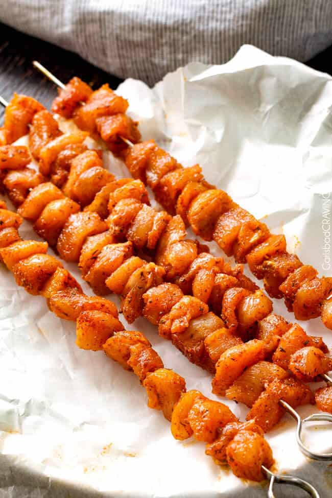 So naturally, in orderย to create theย best barbecue chicken with the most surface area to be coatedย inย an intoxicating spice blendย including smoked paprika, brown sugar, and chili powder then smothered in spell bounding homemade barbecue sauce, I chose to create barbecue chickenย shish kebabsย (small pieces of meat grilled on a skewer).