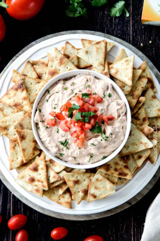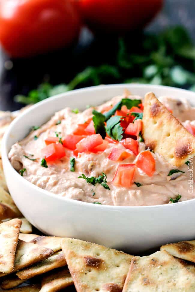 I like to think all of Carlsbad Cravings recipes are really flavorful from my Guacamole, Queso Fundido, Cheesy Chili Dip,ย Queso Verde Corn Dip,ย andย Jalapeno Popper Dip.ย ย If a recipe needs an extra spice โ I am going to add it, even if it means the ingredient list gets a little longer โ because your foodie experience is worth it! ย So for me to post a 3 ingredient Bean Dip recipe and to go a step further and claim it as โthe BESTโ is a shock โ even to myself. ย But I totally believe it is. ย And I think with one chip-full of this Refried Bean Dip you will agree.