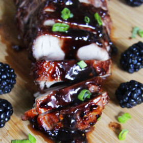 Easy, company pleasing Roasted Pork Tenderloin recipe is simple to make, amazingly juicy and smothered in a sweet and spicy Blackberry Hoisin Ginger Glaze that will have you licking your plate!ย Readers call it, โwonderful,โ โfabulous,โ โ5 starsโ and โfamily went crazy for it.โ Best of all, Iโve included detailed instructions, tips and tricks for succulently juicy oven roasted pork tenderloin every time!