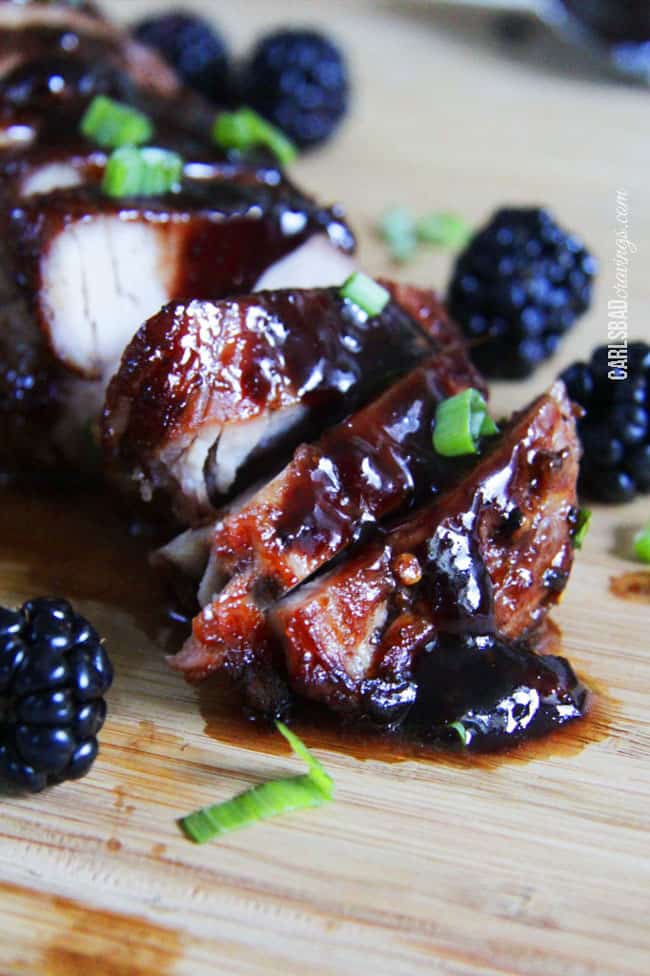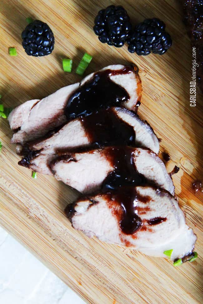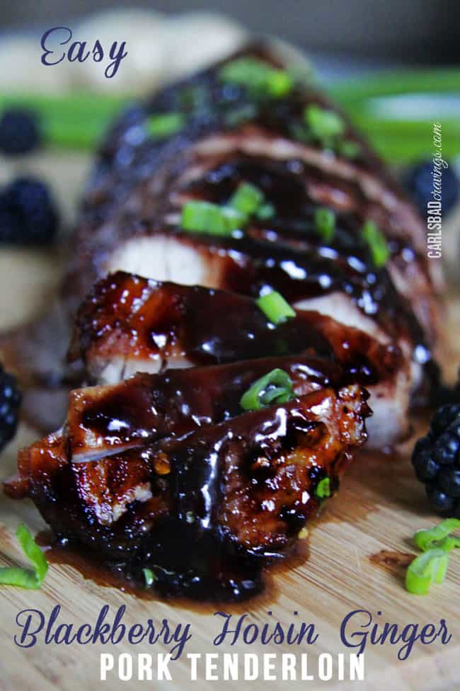 - When pork is done, let stand 10 minutes before slicing. Meanwhile, warm the sauce. Slice pork thinly then drizzle with Blackberry Hoisin Ginger Glaze โ either on a platter or on individual servings.