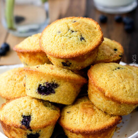 These easy blueberry corn muffins take just 25 minutes from start to finish!ย They are tender, moist, and buttery infused with sweet maple and bursts of juicy blueberries.ย These Blueberry Cornbread Muffins are perfect for brunch, barbecues, potlucks. etc. and the leftovers are equally delicious reheated for breakfast slathered in butter, honey or jam โ but honestly I just eat my Cornbread Muffins plain becauseย they are THAT good!ย