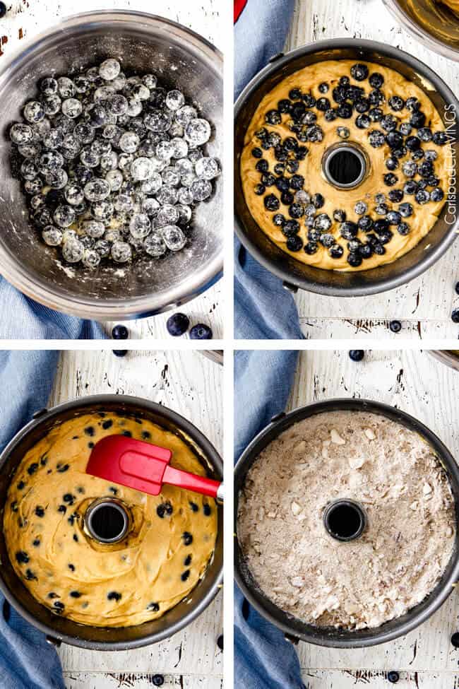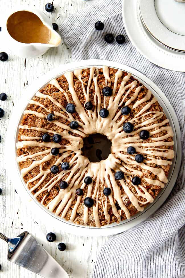 - Use correct pan:ย You need a 16 cup/10-inch nonstick tube pan for this Blueberry Coffee Cake recipe.ย A bundt cake pan will NOT work because it does not have enough volume and the coffee cake will overflow.ย The streusel also wonโt be on top when inverted if you use a bundt pan.