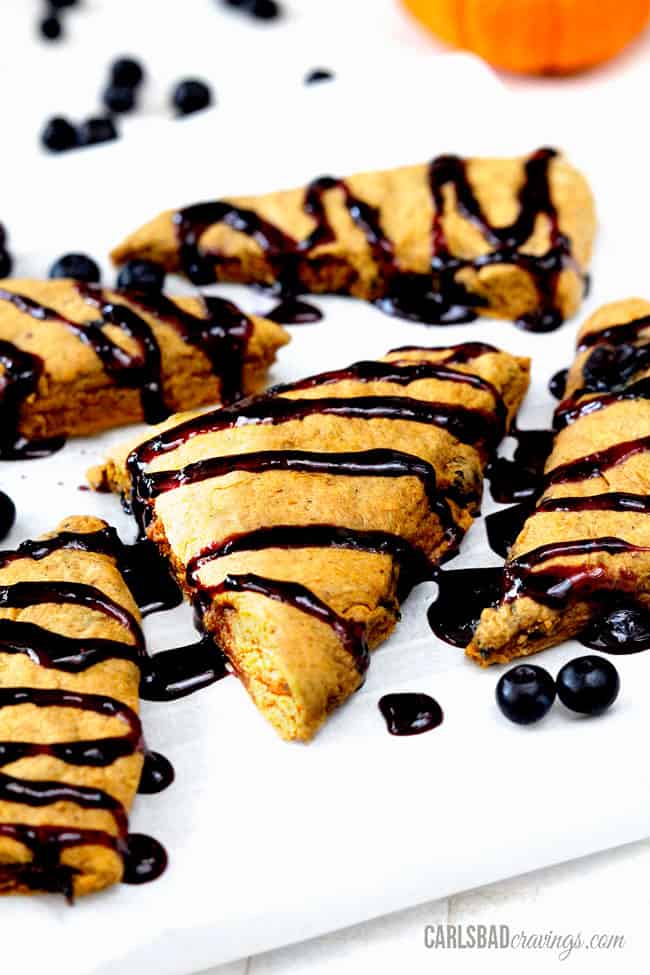 Blueberry and Orange Pumpkin Scones with Cinnamon Blueberry Drizzle.ย Moist pumpkin perfection with sweet blueberries and a hint of refreshing orange. ย Itโs one rockinโ rolling scone.