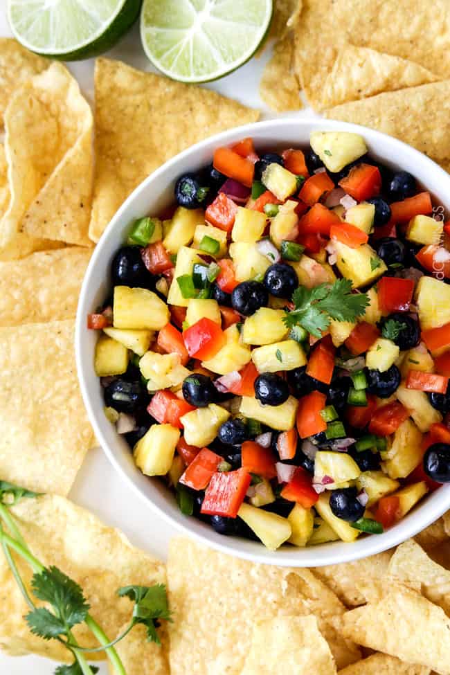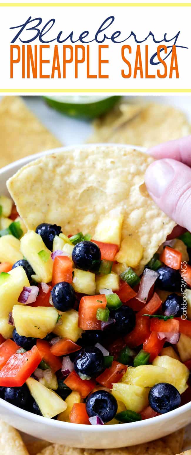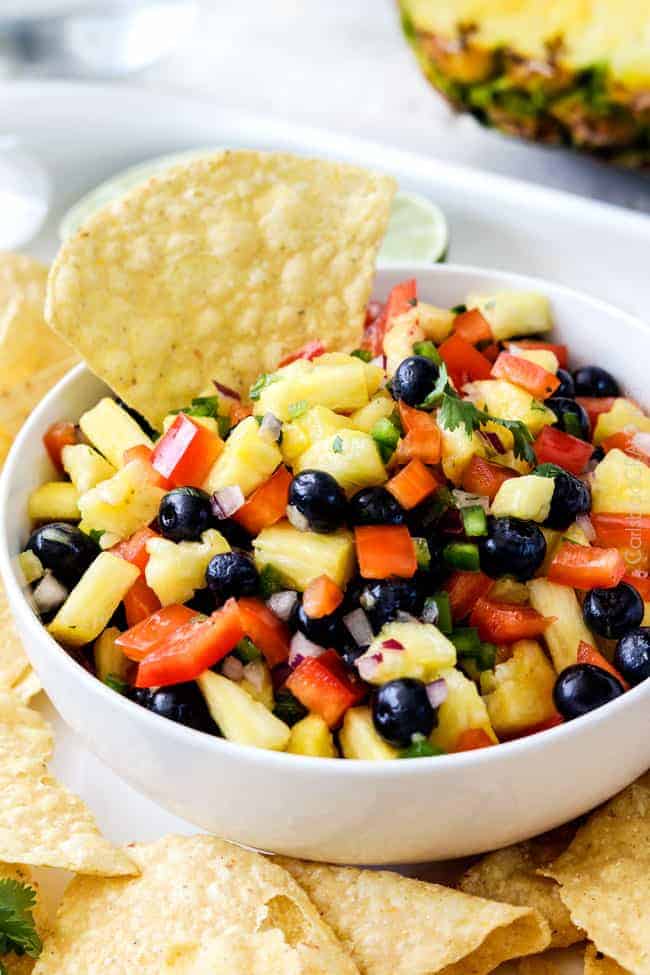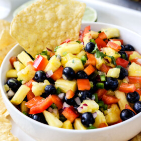 Refreshing sweet, bright Blueberry Pineapple Salsa is addictingly delicious with chips, on chicken, fish, tacos or just a spoon! ย This easy salsa makes everything better and is the easiest tastiest appetizer!