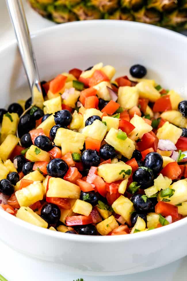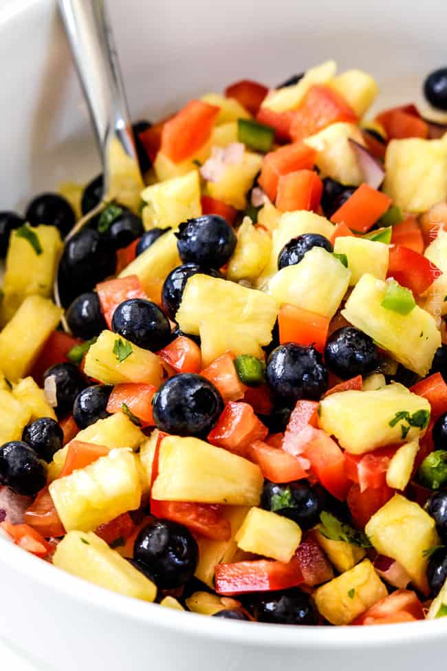 Its exquisite! ย Bright, sweet pineapple, sweetly tart blueberries, crisp red bell peppers, a speckling of jalapenos, red onions and cilantro all splashed with lime juice and a dusting of ground cumin and ginger. ย The perfect harmonious blend that you wonโt be able to stop munching.