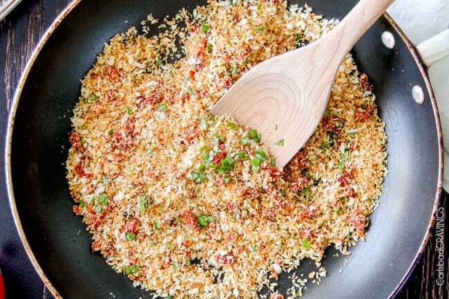 Meanwhile, you are going to toast your bread-like coating of panko in some butter then stir in some sun-dried tomatoes and fresh basil.