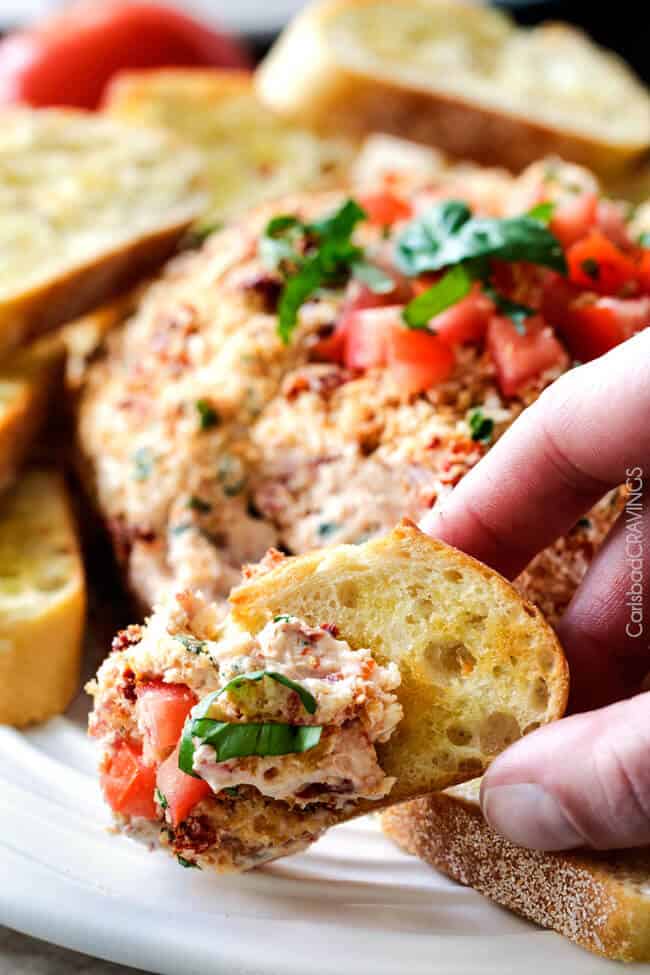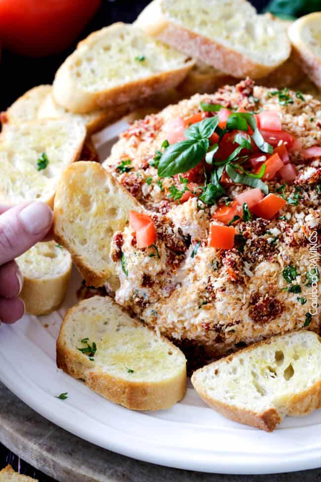 Super easy (make ahead!) Bruschetta Cheese Ball takes just minutes to whip up and is always a total show stopping appetizer! ย Loaded with fresh tomatoes, sun-dried tomatoes, fresh basil, Parmesan, mozzarella and garlic and herb cheese then rolled in crispy panko breadcrumbs all served with toasted baguette slices = irresistibly delicious!ย