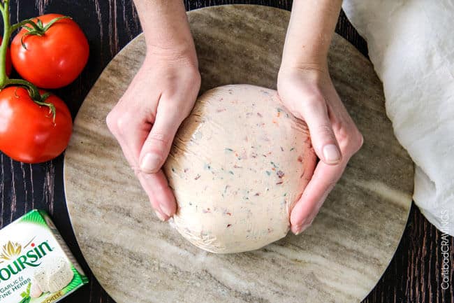 Now back to this Bruschetta Cheese Ball. ย After you have mixed your ingredients together, you drop the cheese mixture onto a large piece of plastic wrap and roll it up tightly into a ball. ย Donโt worry about it being perfect โ you can reshape it later โ then let it harden a bit in the the freezer for 1-2 hours or in the refrigerator until you are ready for it.