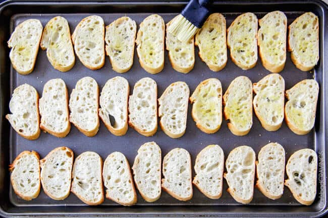 - Baguette slices: Preheat oven to 425 degrees F. Line 1-2 large baking sheet with baguette slices. Brush top sides of slices with olive oil and flip all the slices over so the olive oil is SIDE DOWN on the baking sheet. Bake for 6 to 8 minutes or until slightly golden around the edges.