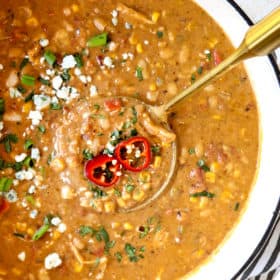 This Buffalo Chicken Chili recipe is a buffalo twist on my readerโs favorite Mexican Chicken Corn Chowder.ย I took the creamy base, added buffalo sauce, white beans, celery and a new star was born. It combines a deeply complex flavor profile thatโs absolutely mesmerizing with sensational creaminess thatโs on your table in just over 30 minutes! ย