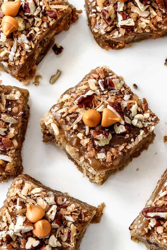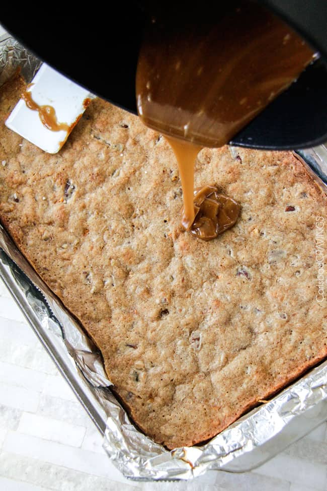 - Once cool, add all of the Butterscotch Glaze ingredients to small heavy saucepan over medium heat and continue to stir until butter is melted. Bring to a boil and continue to simmer over medium high heat (it will bubble a lot) until slightly thickened, about 90 seconds. Remove from heat and as soon as bubble subsides, pour all over blondies and spread immediately with a rubber spatula (before it hardens). Immediately sprinkle Glaze with ยฝ cup pecans and ยผ cup coconut. Once Glaze has set (about 15 minutes), cut into small squares to serve.