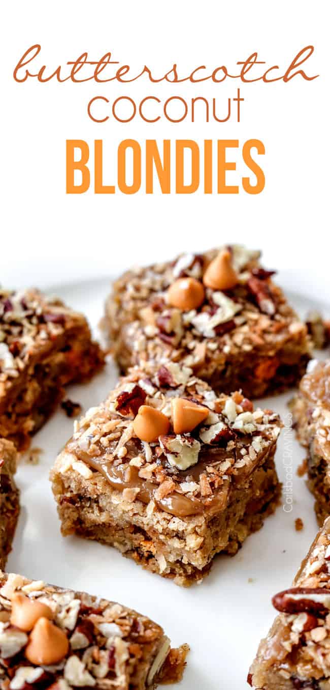 You guys, I am so excited to bring you these Butterscotch Coconut Blondies! ย I was going on and on and on about how amazing these are to my brother in NY when he said I needed to post the recipe ASAP so he could make them ASAP. ย I could have emailed him the recipe, but the whole world needs these blondies ASAP, so here they are!