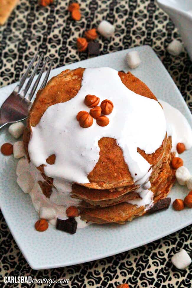 Happy almost National Sโmores Day with Fluffy Sโmores pancakes! Now please go stuff your face with forkfuls of butterscotch, chocolate, graham cracker, marshmallowย syrup riddled bites AKA sโmore deliciousness than you thought possible!
