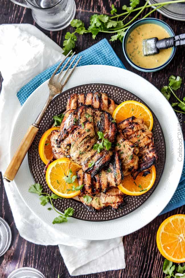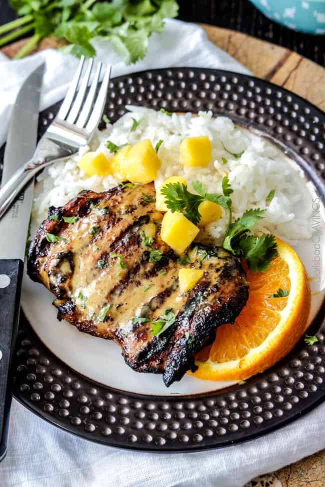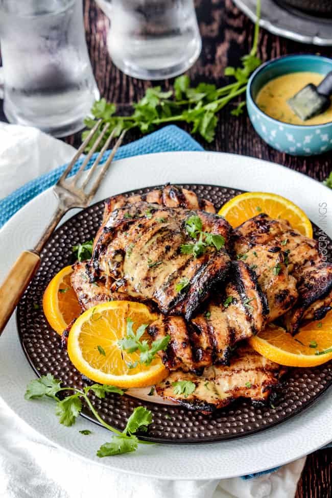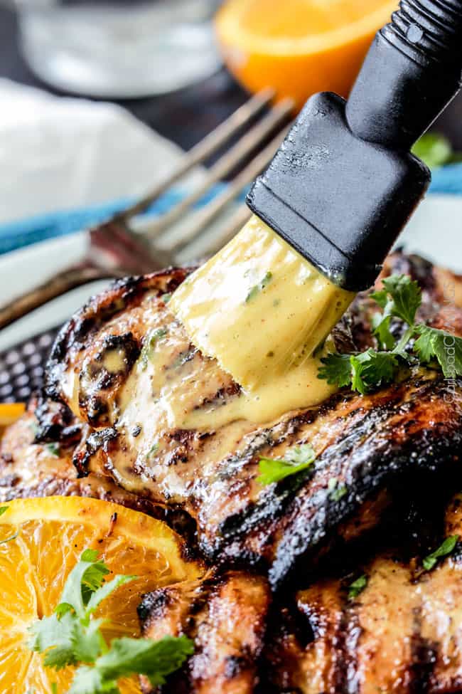 The sauce is simply the leftover unused marinade that you separate out from your chicken marinade and blend it with cilantro, sour cream and mayo. ย Itโs creamy, sweet and spicy deliciousness will leave you weak at the knees. ย A good kind of weak. ย A weak that means I love you so much I must have more!ย